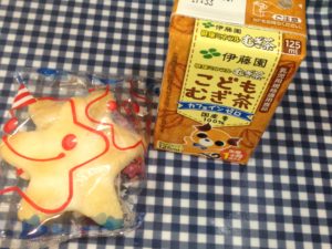 きょうのおやつは、おせんべいと麦茶です。(避難訓練のため)