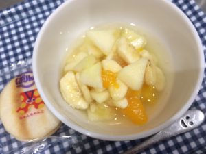 きょうのおやつは、フルーツポンチとおせんべいです。