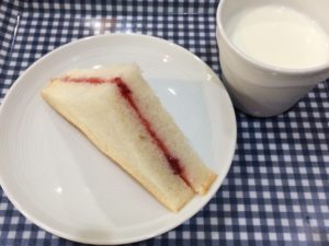 きょうのおやつは、ジャムサンドと牛乳です。