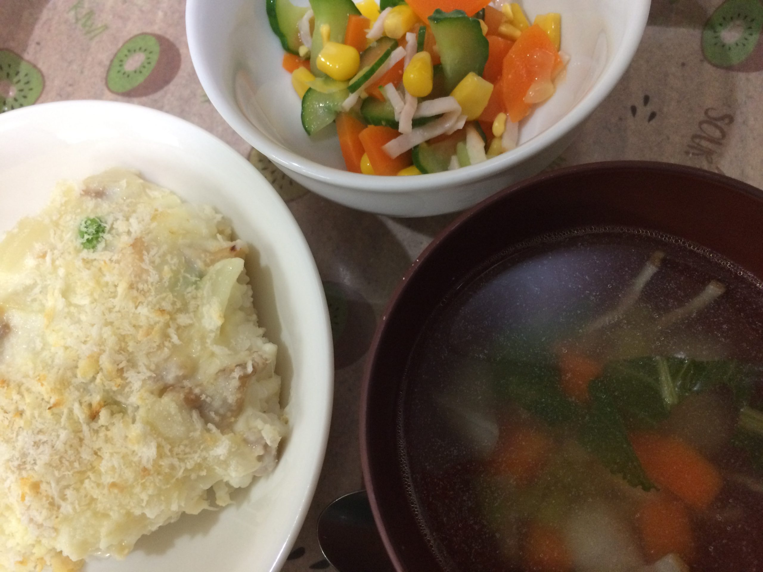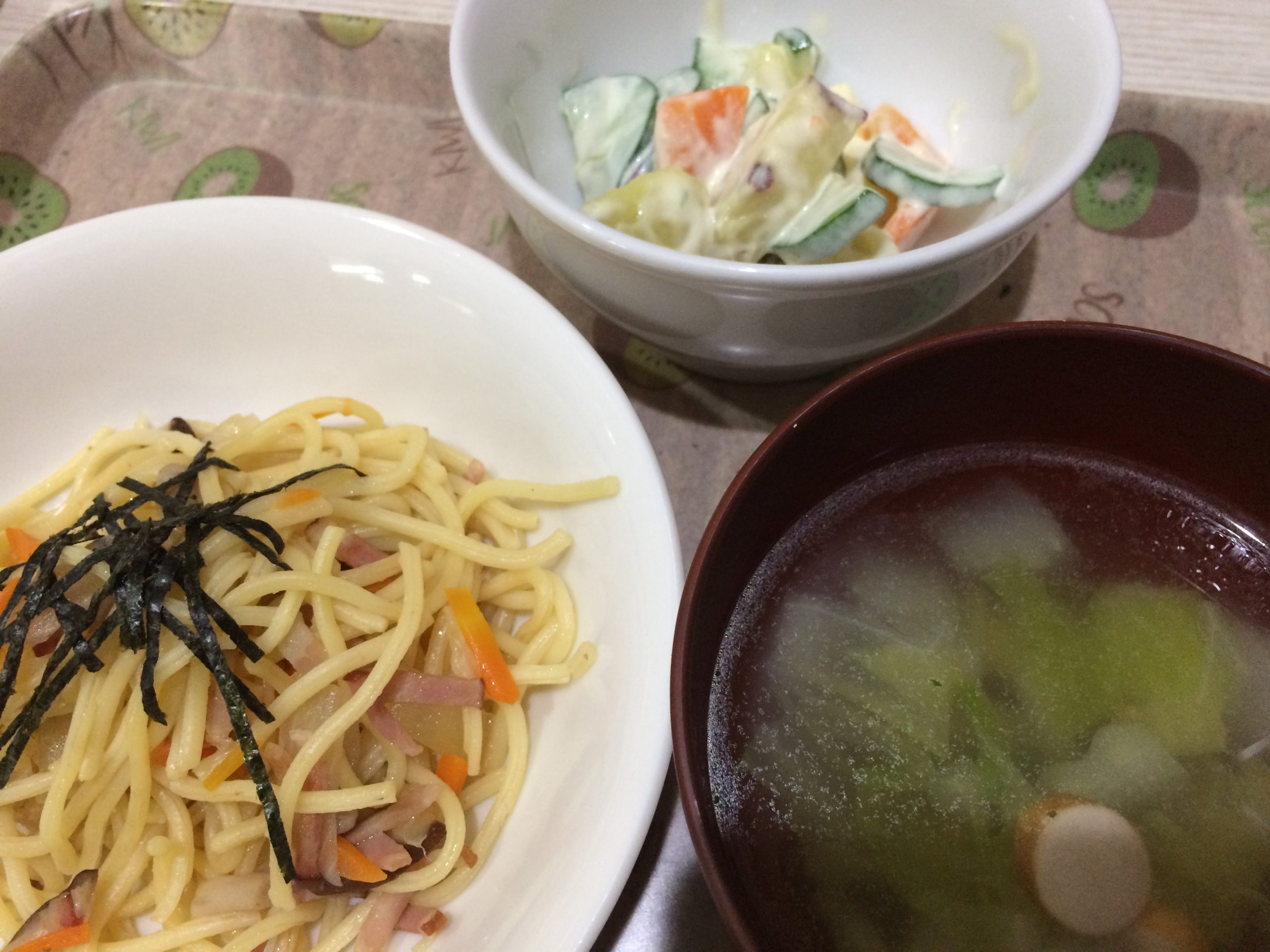 ベーコンときのこのスパゲッティー 白菜のスープ さつまいもサラダ...