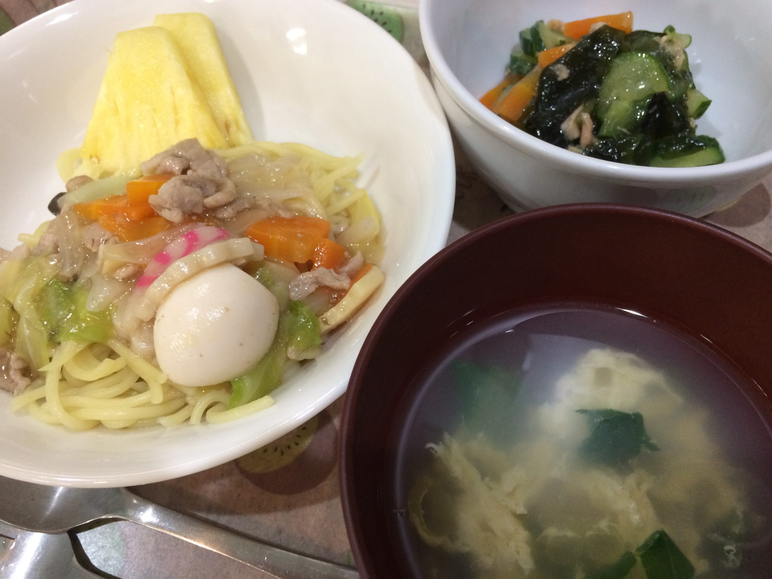 あんかけ焼きそば 小松菜のスープ わかめサラダ パイナップル...