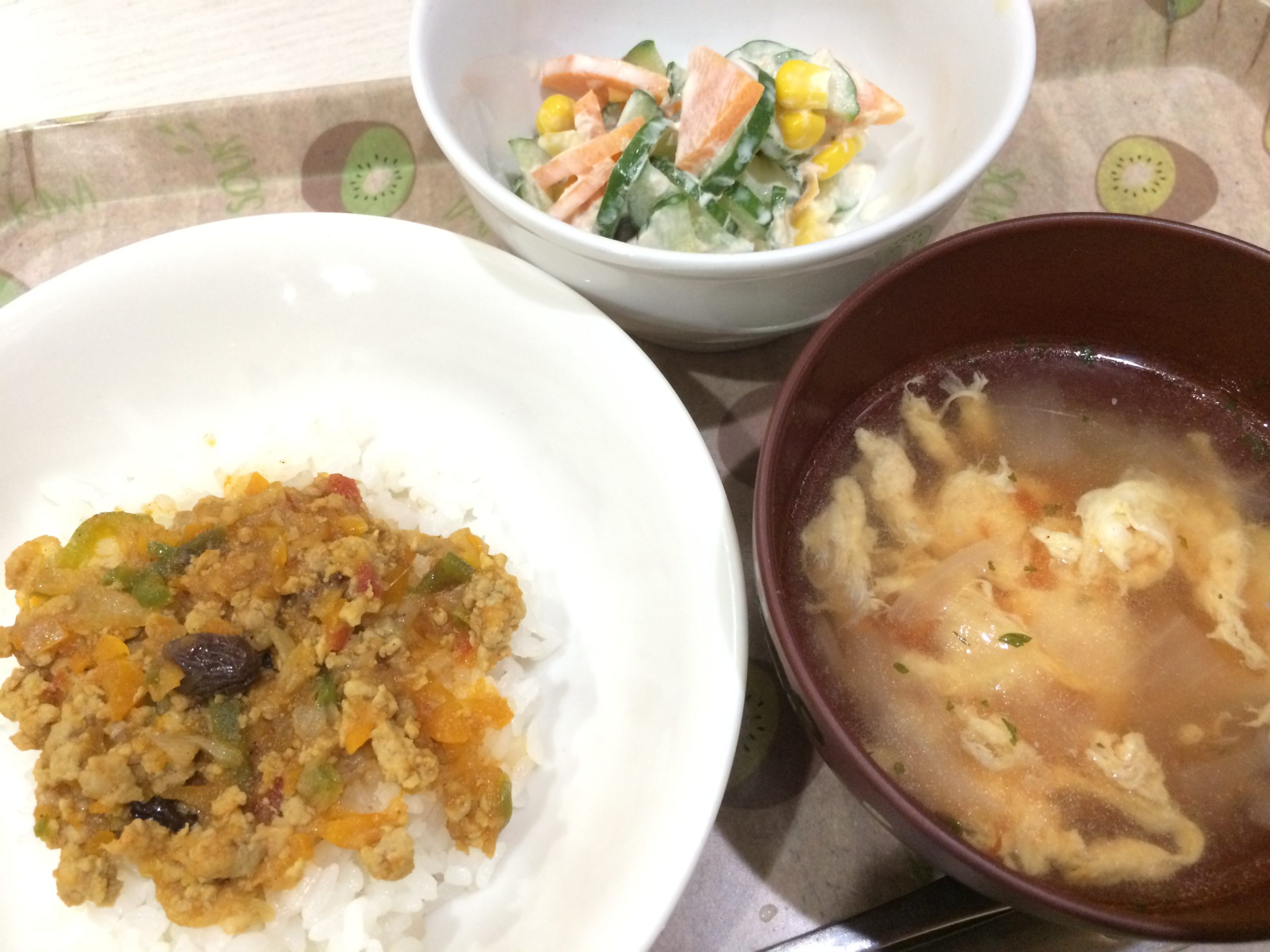 ネギとじゃこのチャーハン わかめととうふのスープ とりのごまマヨネーズ焼き えのきとこまつなのあえ物...