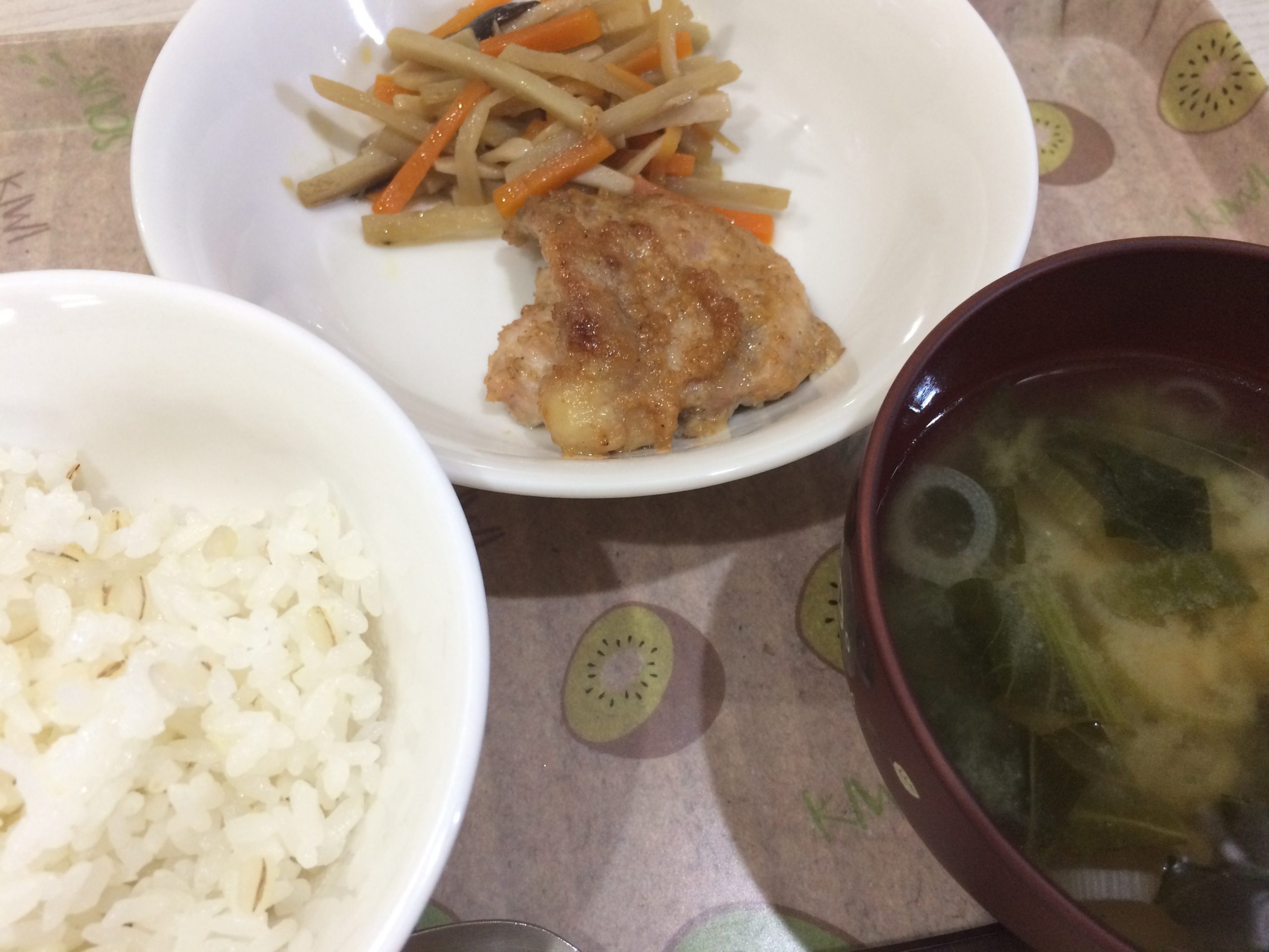 【かみかみ・もぐもぐ献立】 むぎごはん こまつなと厚揚げのみそ汁 とりのごまマヨ焼き かみかみきんぴ...