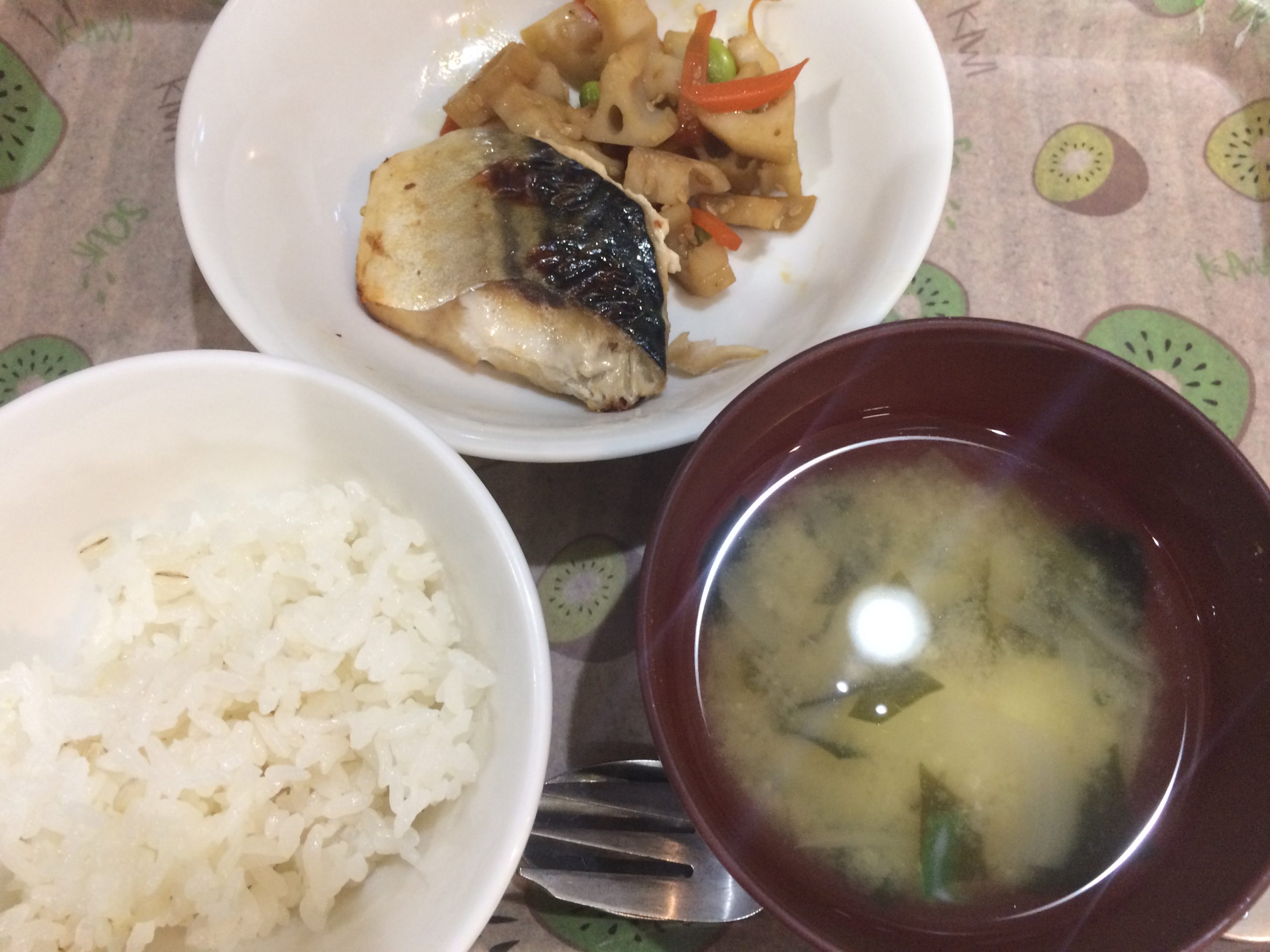 むぎごはん たまねぎのみそ汁 さばの梅風味焼き れんこんきんぴら...