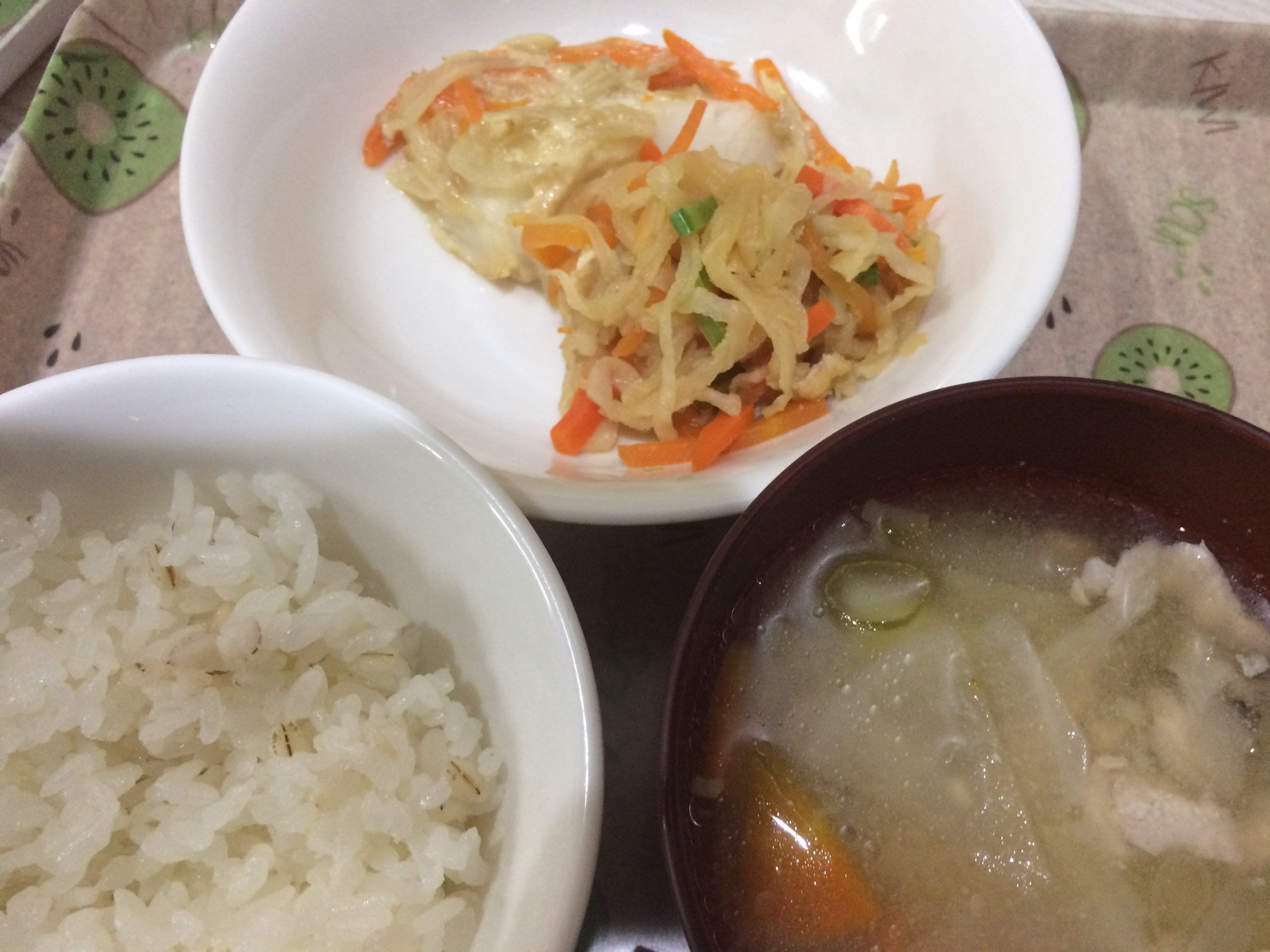 むぎごはん とん汁 白身魚のホイル焼き 切り干し大根の煮物...